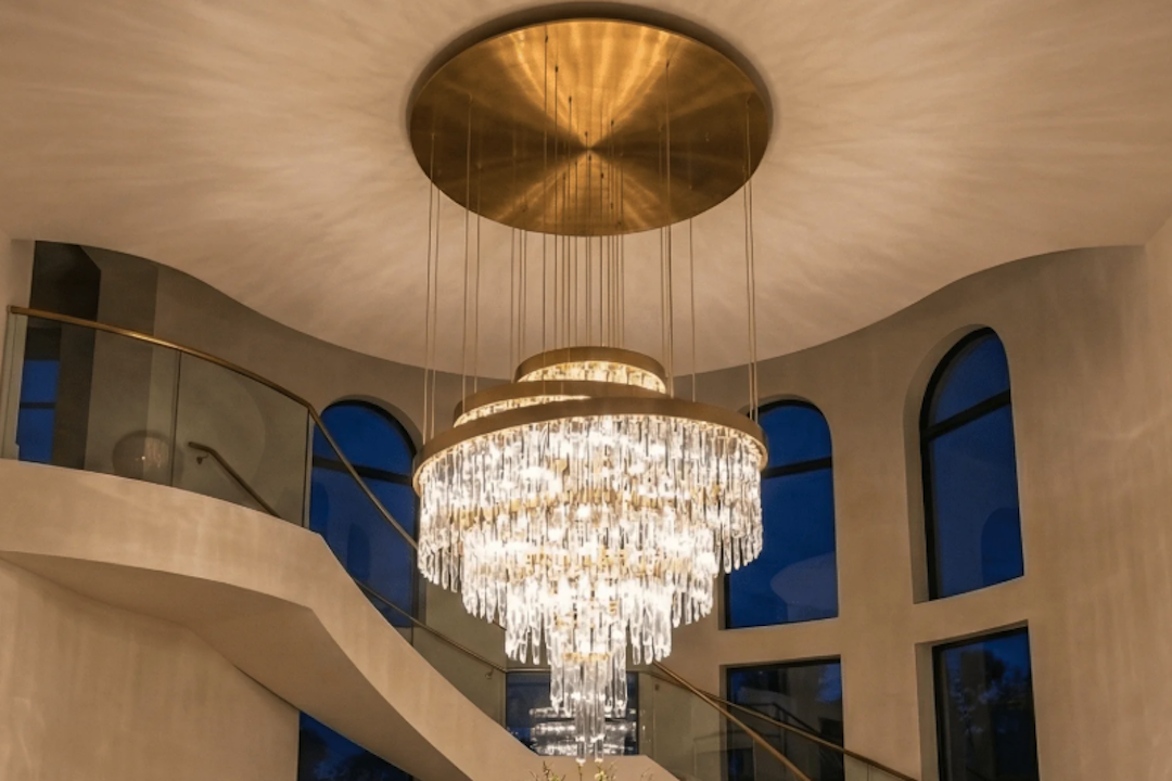 The chandelier should not be an isolated object but an extension of the foyer’s architectural style and design intent.